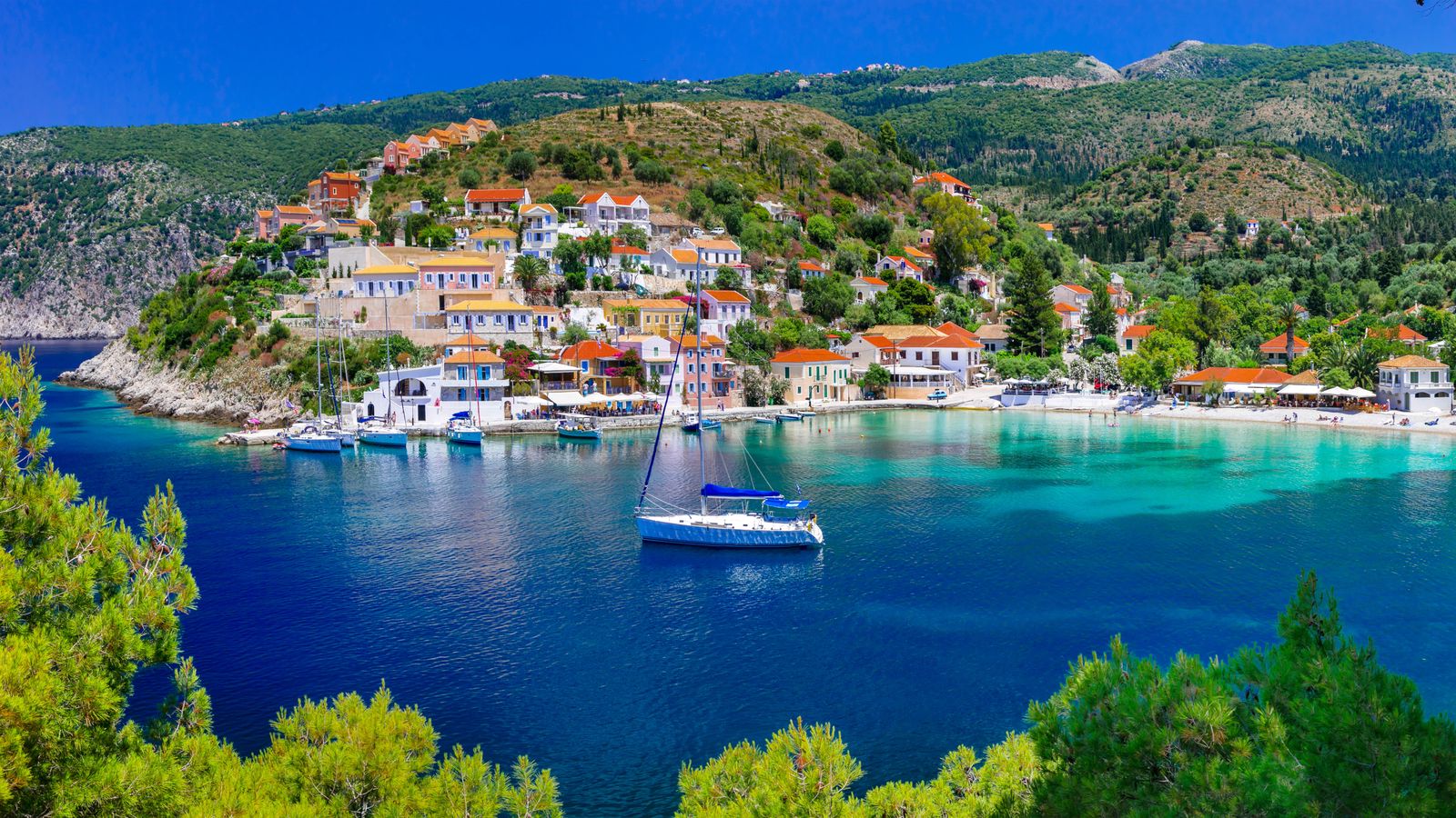 Sail across to Fiskardo on the northern tip of Kefalonia — arguably the most beautiful village in the Ionian. The pastel-colored Venetian houses are perfectly preserved. Arrive early to secure a berth on the quay.